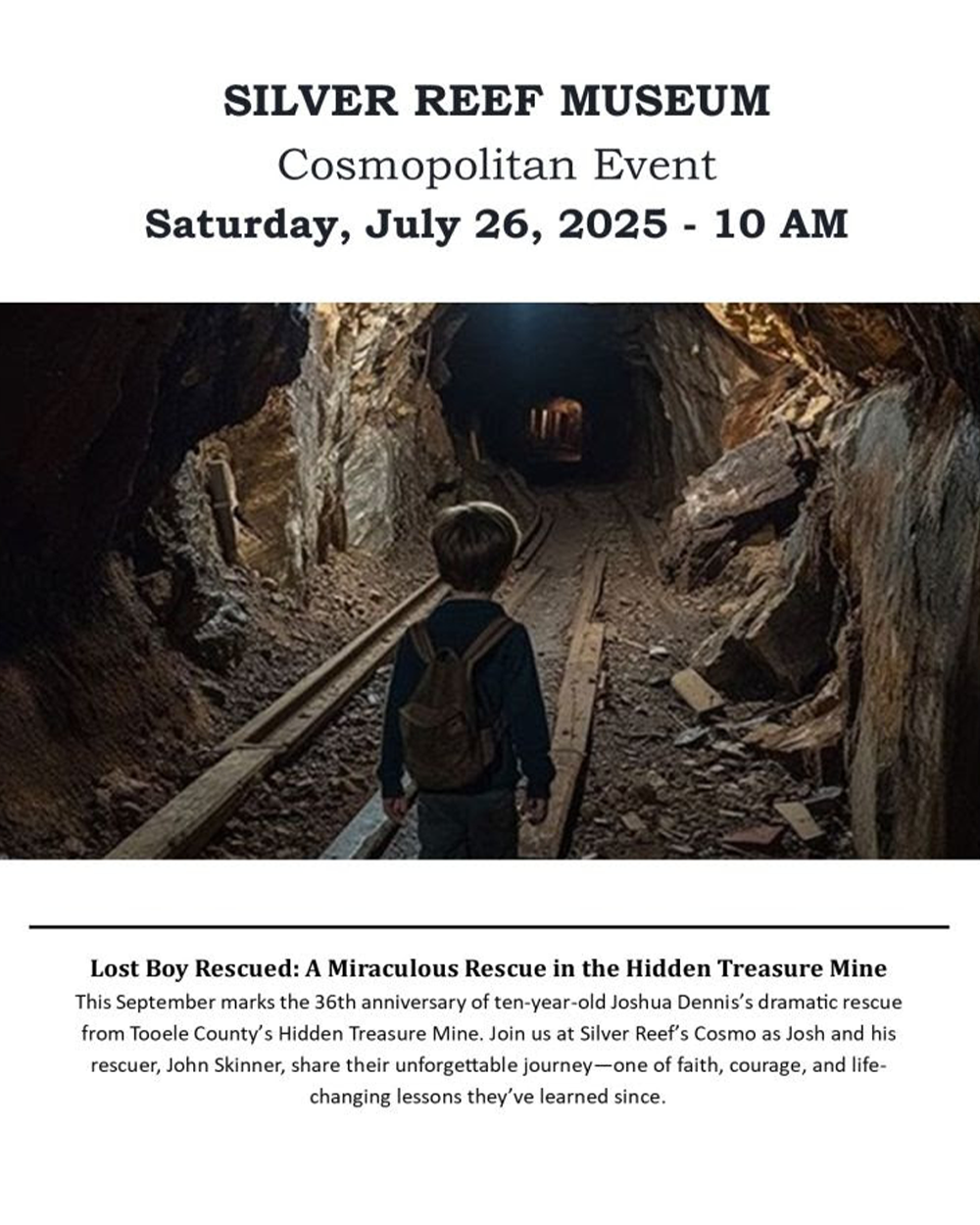 This September marks the 36th anniversary of ten-year-old Joshua Dennis’s dramatic rescue from Tooele County’s Hidden Treasure Mine. Join us at Silver Reef’s Cosmo as Josh and his rescuer, John Skinner, share their unforgettable journey-one of faith, courage, and life- changing lessons they’ve learned since.
