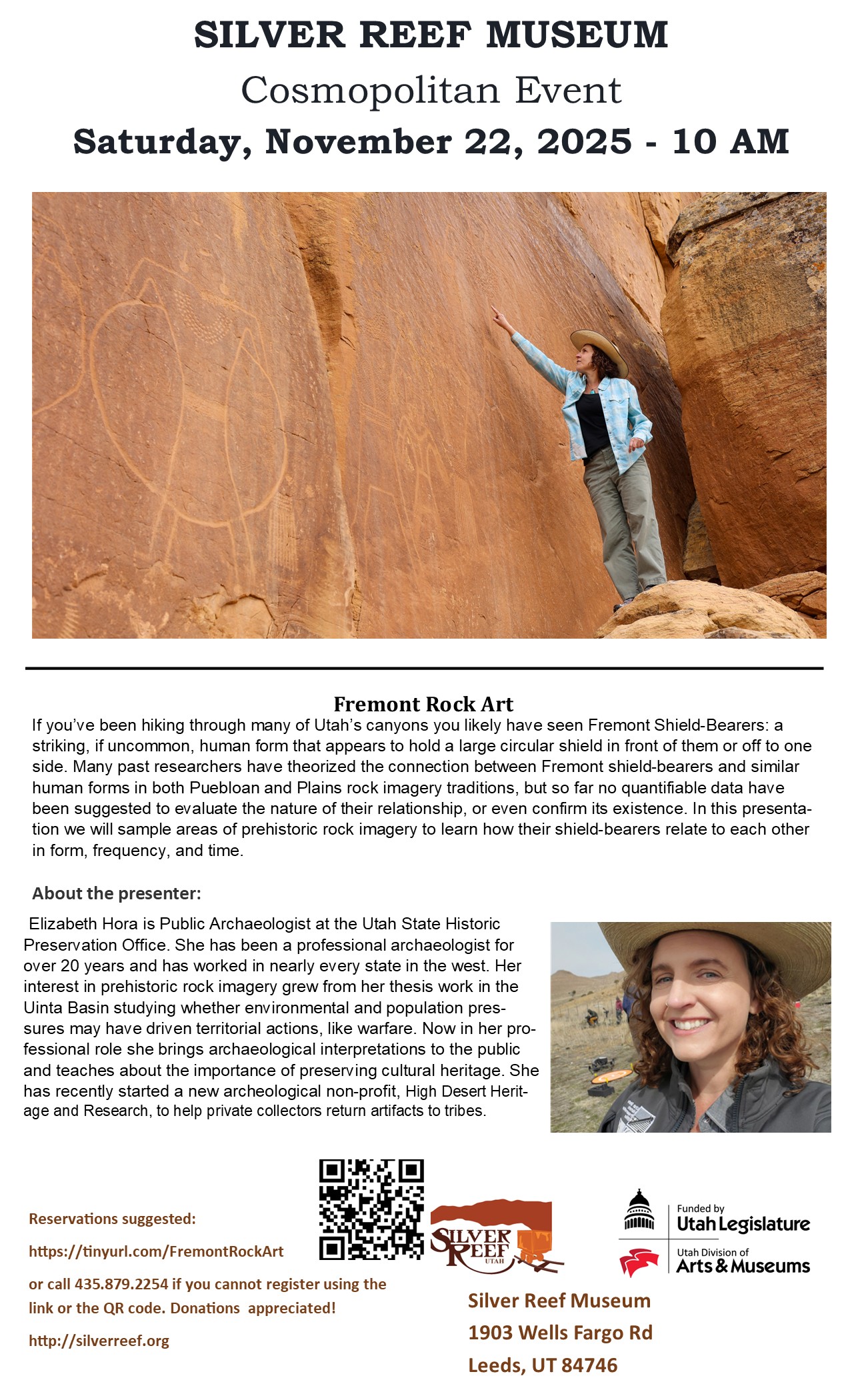 Elizabeth Hora is Public Archaeologist at the Utah State Historic Preservation Office. She has been a professional archaeologist for over 20 years and has worked in nearly every state in the West. Her interest in prehistoric rock imagery grew from her thesis work in the Uinta Basin studying whether environmental and population pressures may have driven territorial actions, like warfare. Now in her professional role she brings archaeological interpretations to the public and teaches about the importance of preserving cultural heritage. She has recently started a new archaeological non-profit, High Desert Heritage and Research, to help private collectors return artifacts to tribes.